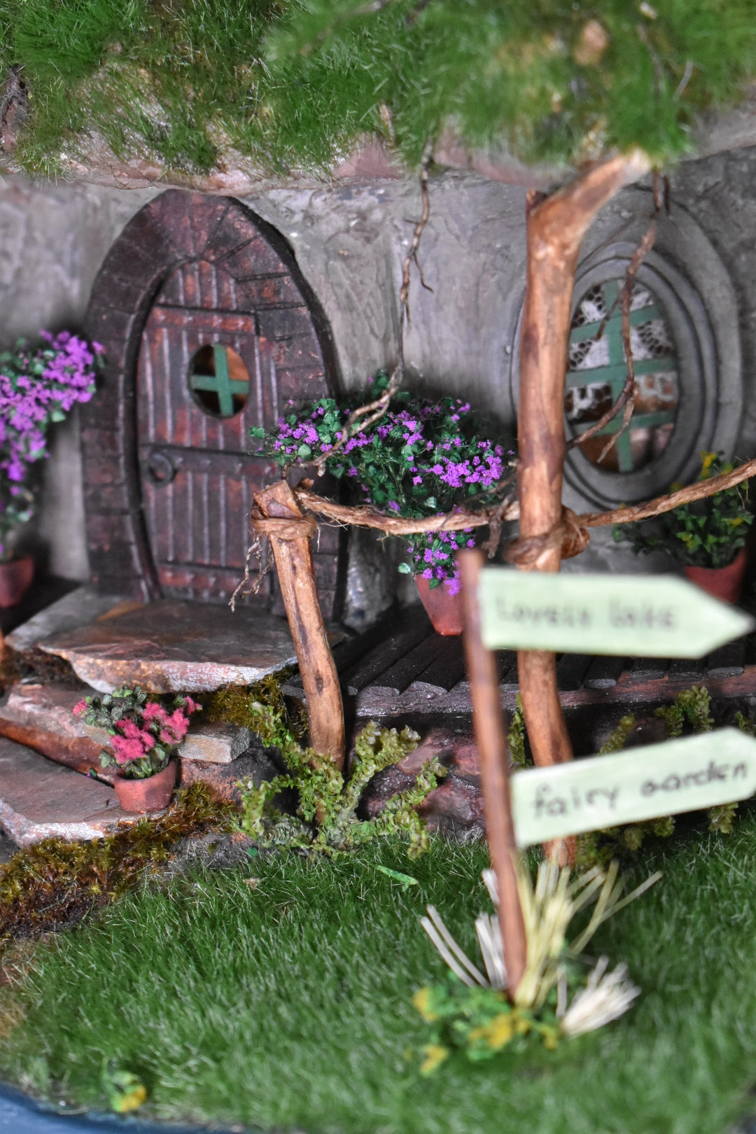 Bring charm to your space with the miniature diorama old Cosy House with flowers. Within a small space lies a house with weathered brick walls, an old green door, and a tiny mailbox. A miniature bench nestles beside the house, accompanied by an old tree. The entrance is adorned with two tiny clay pots containing realistic floral arrangements that match the scale and look very picturesque. The diorama stands on a cork base and is protected by a glass dome.